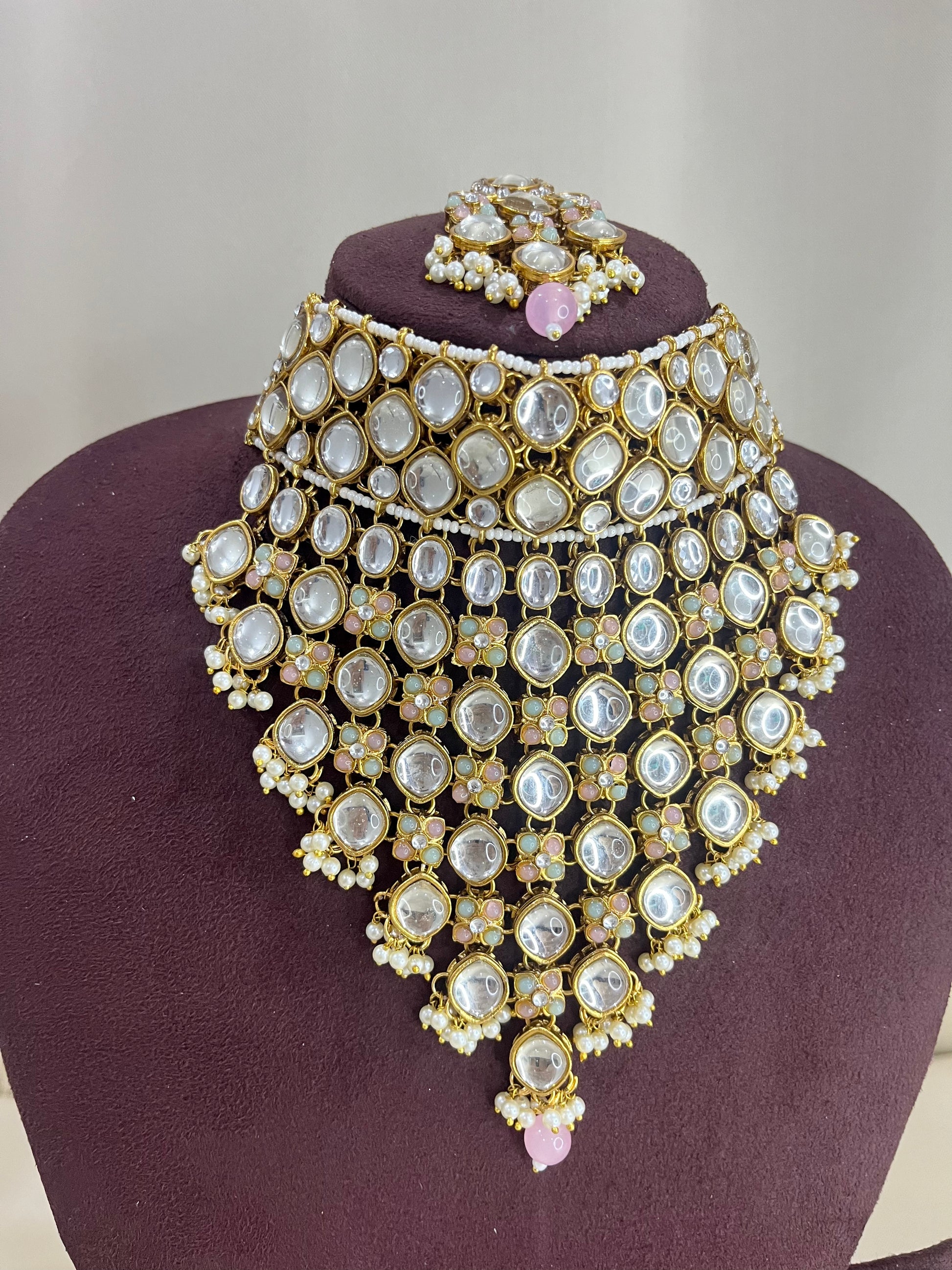 Moissanite Kundan Necklace Set - Pearl & Pink