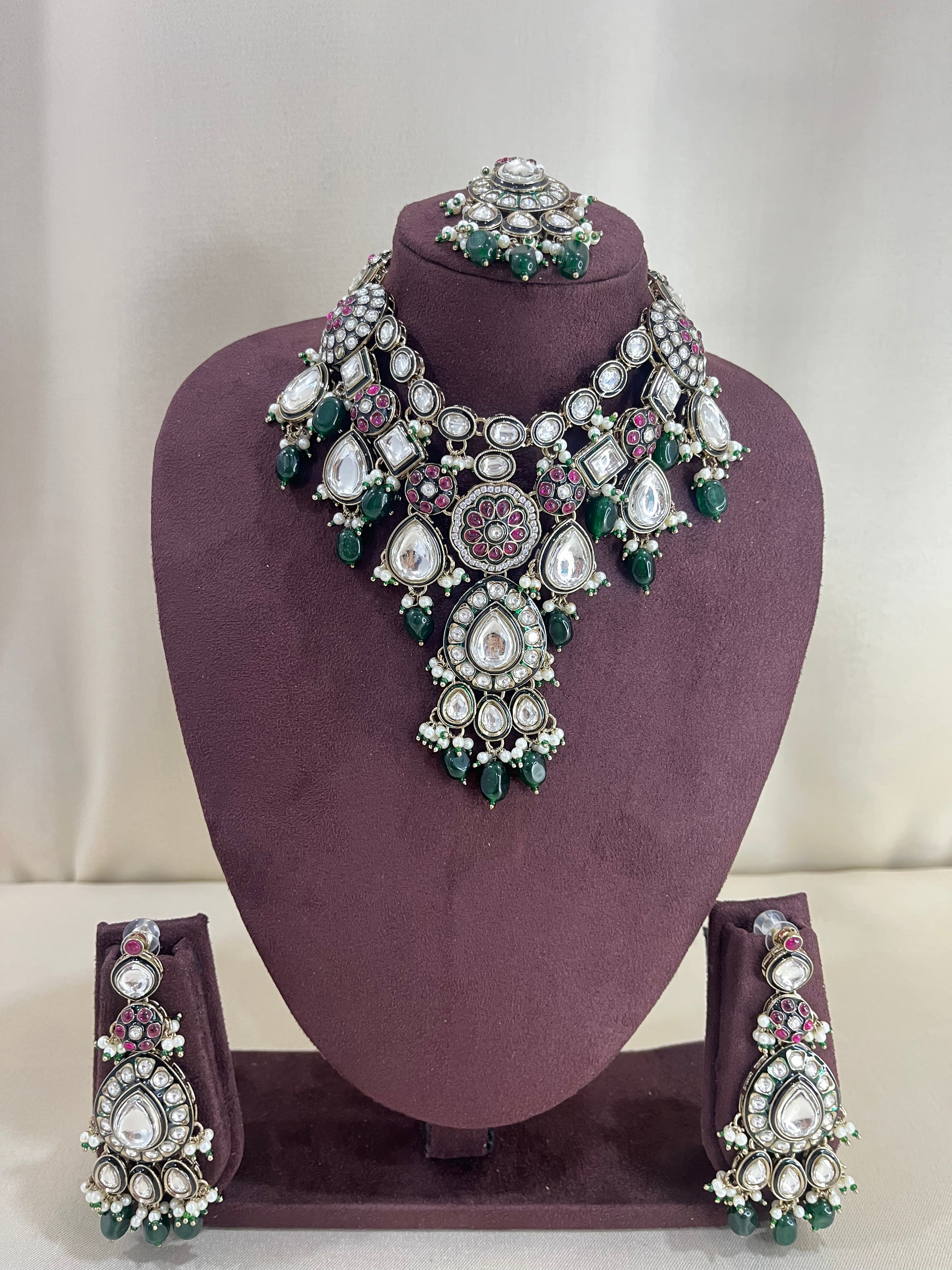 Moissanite Kundan Semi Bridal Necklace Set - Emerald Green