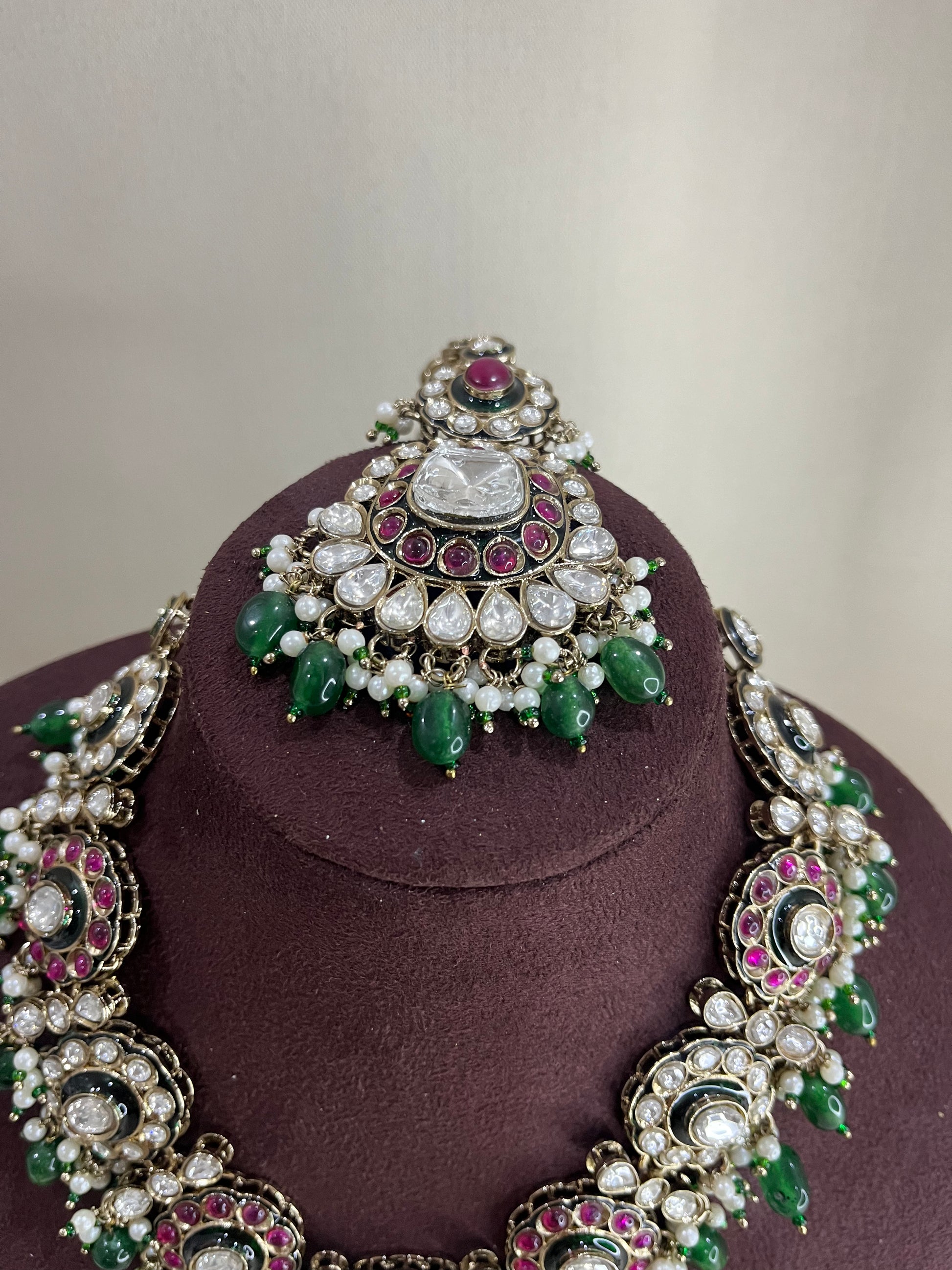Moissanite Polki Necklace Set - Emerald & Ruby