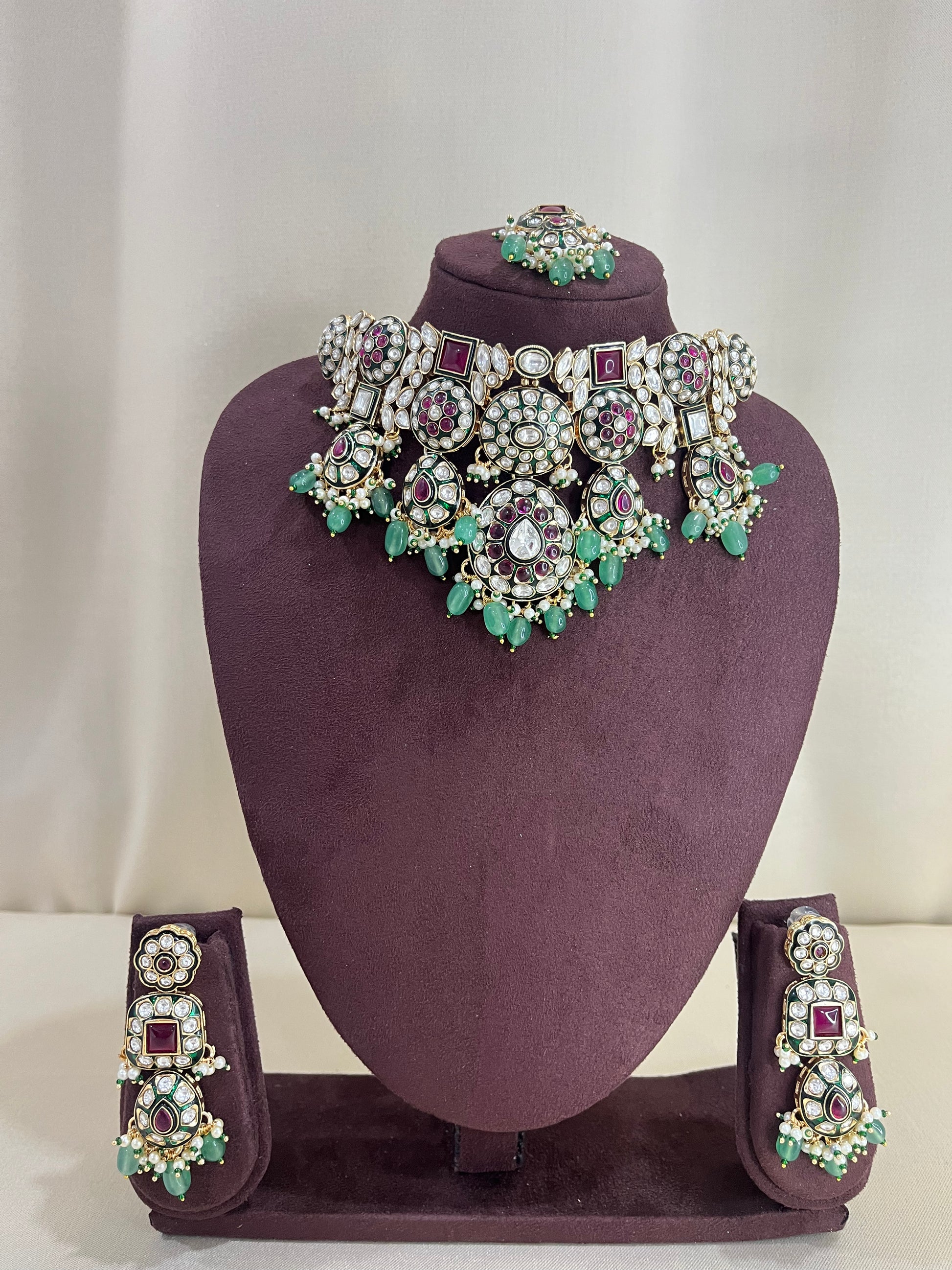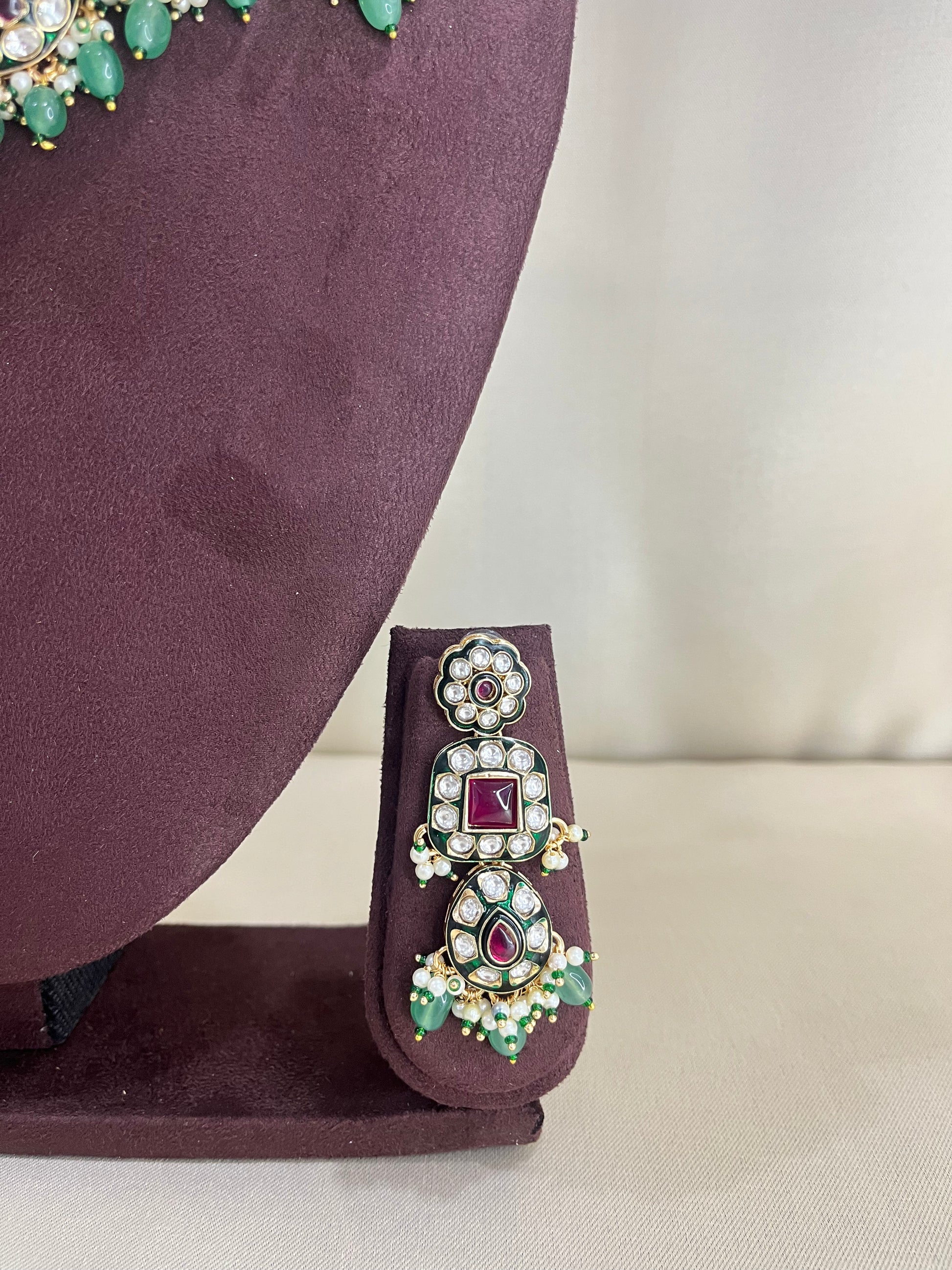Moissanite Semi Bridal Necklace Set - Mint & ruby