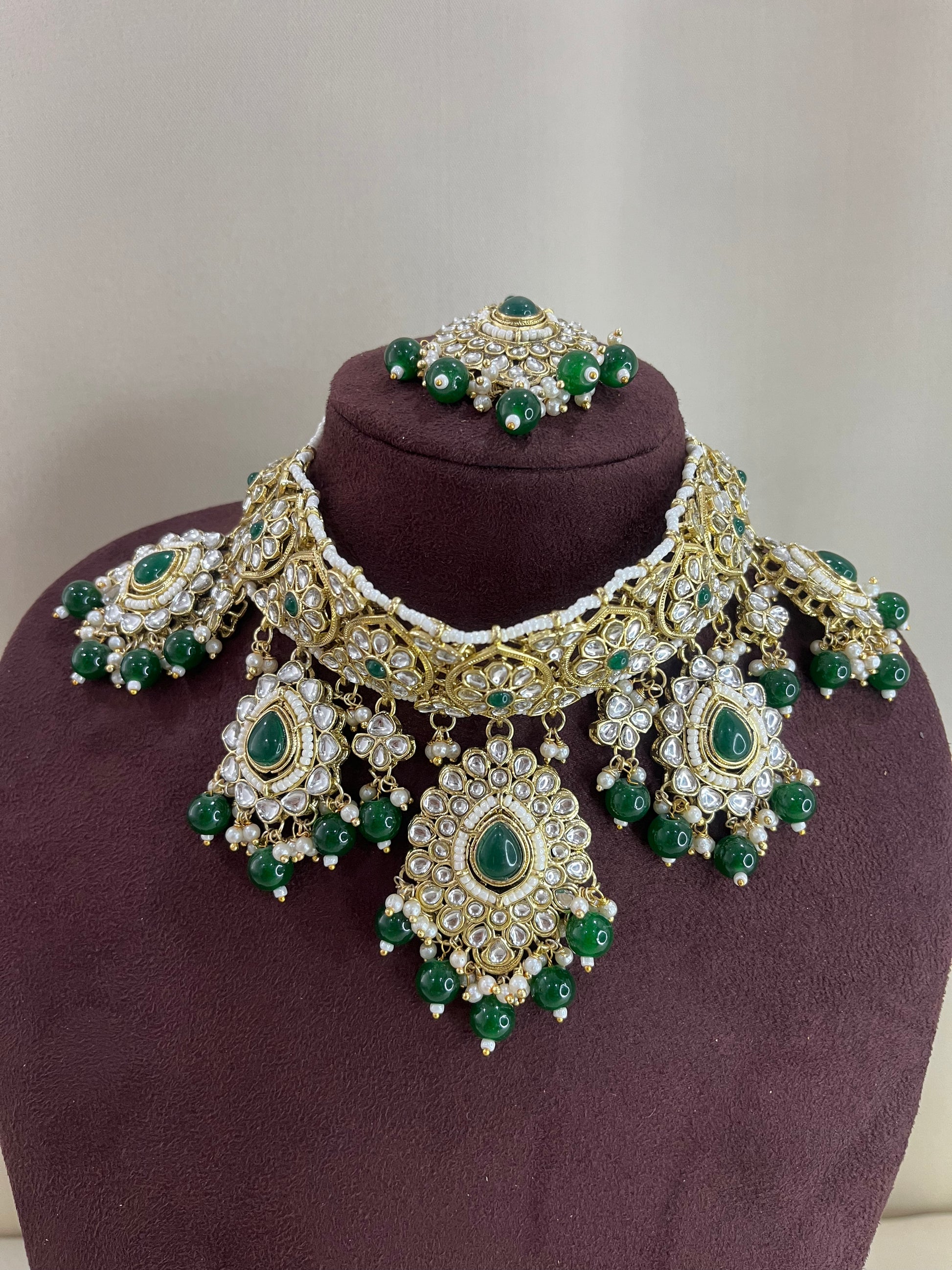 Paachi Kundan Choker Set With Tika - Emerald Beads