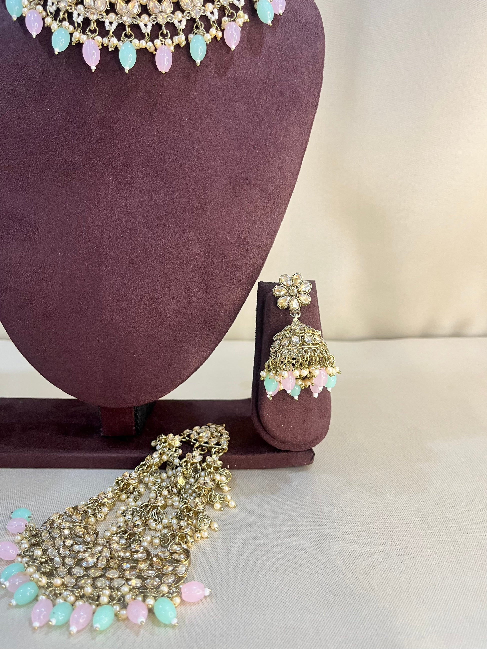 Reverse AD Necklace Set With Pasa - Pink & Mint